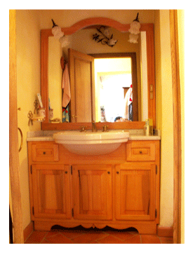 Modello classico con tre sportelli e due cassetti, in legno tulipiè con finiture in legno di ciliegio. Frontale sagomato per alloggiamento lavello da semi incasso con possibilità di montaggio piano qualsiasi natura. Speccio con cornice legno identica essenza da appendere a parete.