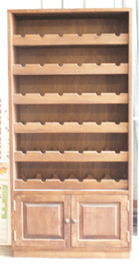 Realizzata in legno di larice naturale con finiture in noce. Comodi ripiani per alloggiamento bottiglie e due portellinella parte inferiore per contenimento accessori. Possibilità di verniciatura o finitura a cera.