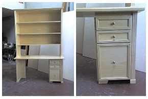 Realizzazione mobile scrivania in legno di frassino naturale, completo di n° 2 cassetti e sportello nella parte inferiore e scaffale di tipo a giorno con n° 4 ripiani. Mobile da verniciare o lucidare a cera.